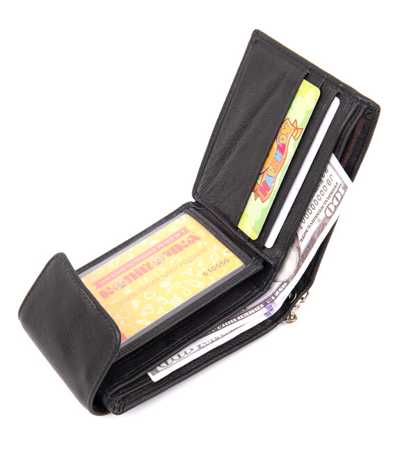 Портмоне для чоловіків і жінок в класичному чорному кольорі з невимушеним дизайном. Тонке і м'яке шкіряне портмоне з слотами для кредиток кишенькою для монет і відділеннями для купюр. Аксесуар дуже стильний і доповнений самим необхідним функціоналом без зайвих деталей. Портмоне має ланцюжок з карабіном. За нього ви зможете підчепити ваш аксесуар за лямки поясу і таким чином забезпечити йому додаткову безпеку від крадіжки. Хочемо зазначити, що ланцюжок у моделі не знімається. Купюри поміщаються в розгорнутому вигляді. Аксесуар - кращий подарунок як для себе, так і на подарунок.
