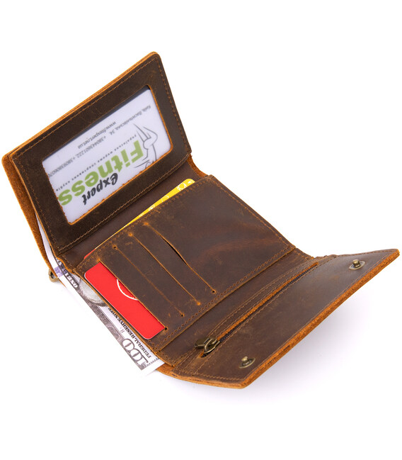 Тонке компактне матове портомне з натуральної шкіри з двома кнопками. Виріб має коричневий насичений колір і виконаний в вінтажній шкірі. В процесі експлуатації на поверхні винтажної шкіри з'являються потертості і подряпини, які створюють ефект старовини. Портмоне поміститься в маленьку сумку або кишеню брюк. Гаманець стане прекрасним подарунком для ваших близьких. Портмоне має весь самий необхідний функціонал. Гаманець дуже приємний на дотик. Підійде для тих, хто не любить великих аксесуарів.