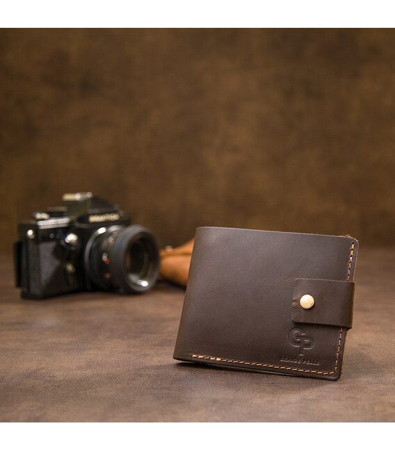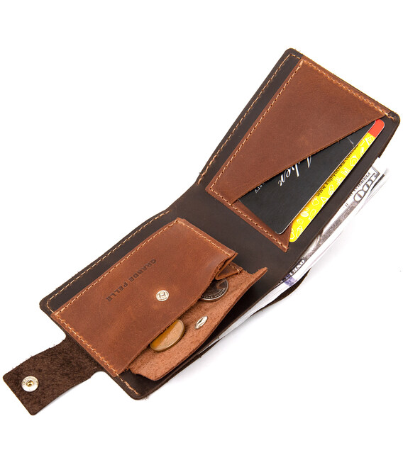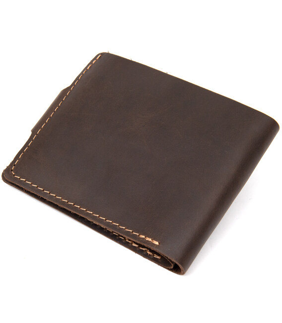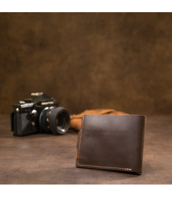 Компактне чоловіче портмоне з високоякісної вінтажної шкіри. Має гарний шоколадний колір, всередині монетниця і кишенька для карток мають більш світлий відтінок. Це портмоне має досить оригінальний вигляд, тому обов'язково сподобається неординарним особистостям. Упаковано портмоне в фірмовий чохол.