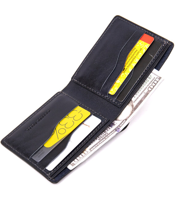 Просте, але в той же час функціональне портмоне з натуральної шкіри високого класу. Має насичений чорний колір і акуратні темні шви. Завдяки, своїм компактним розмірам легко поміститься в будь-якій сумці або кишені штанів. Даний аксесуар може стати чудовим подарунком на будь-яке свято.