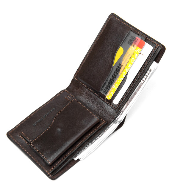 Практичне і функціональне чоловіче портмоне невеликого розміру, яке легко поміститься в будь-яку сумку або кишеню. Всередині є містке відділення для банкнот, 3 кишеньки для кредитних або візитних карток і монетниця на кнопці. Гарний насичений колір надає гаманцю особливий незабутній шарм.