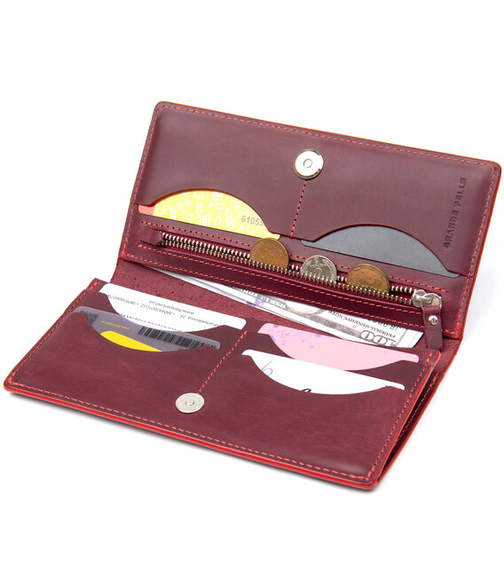 Практичне шкіряне портмоне високої якості виконання і матеріалів. Фактура виробу - вінтажна, що стало трендом в сучасному світі моди. Усередині представлено функціональне наповнення у вигляді відділень для купюр, монет та інших дрібниць, а також для кредитних карт. Цей виріб стане незабутнім подарунком для коханої людини.