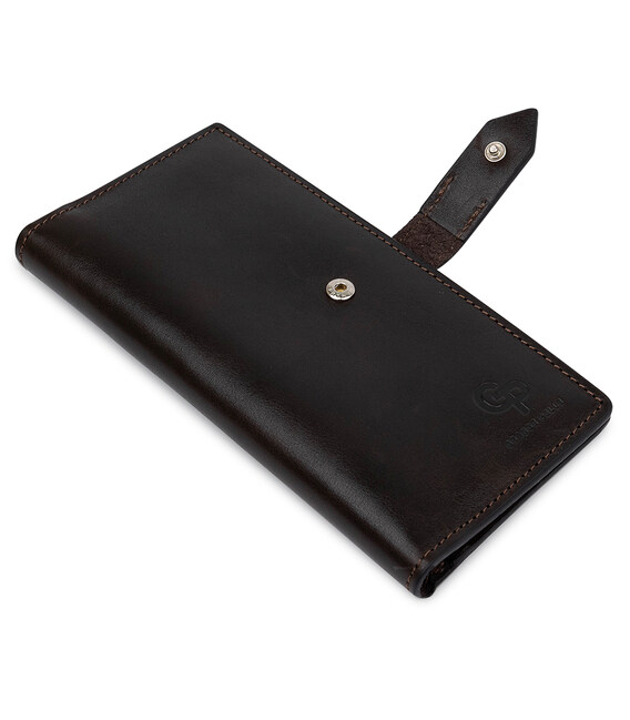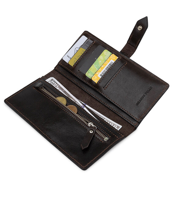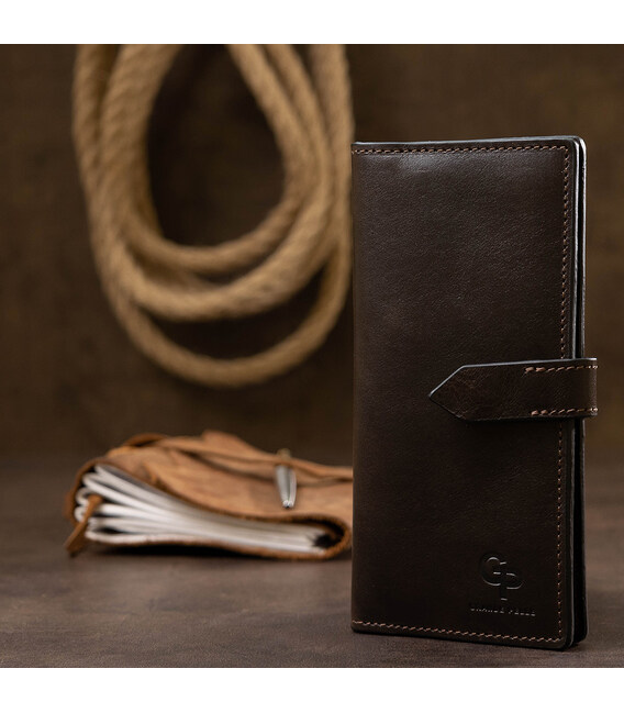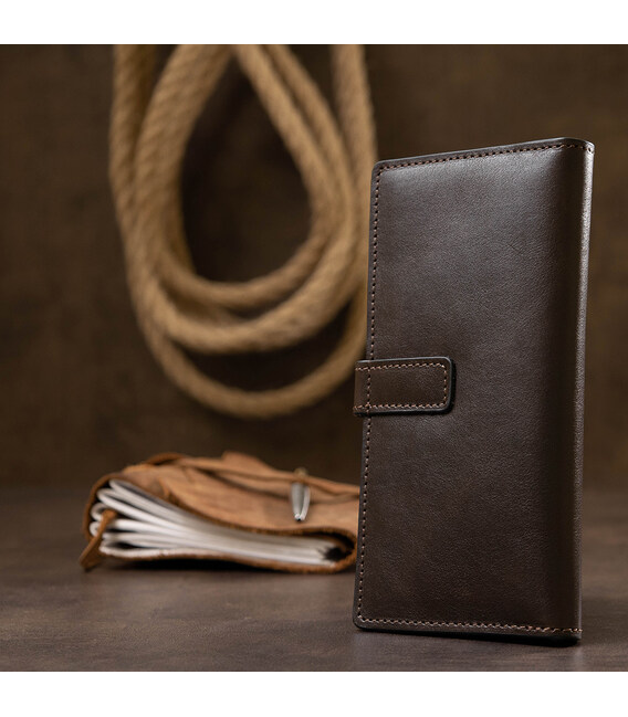 Практичне і містке чоловіче портмоне з натуральної зносостійкої шкіри від українського виробника. Виконано в красивому шоколадному кольорі з гладкою глянсовою фактурою. Має просторі відділення для купюр, зручну монетницю на блискавці і кишені для пластикових карт або візиток. Упакований аксесуар в картонну коробку з фірмовим логотипом.