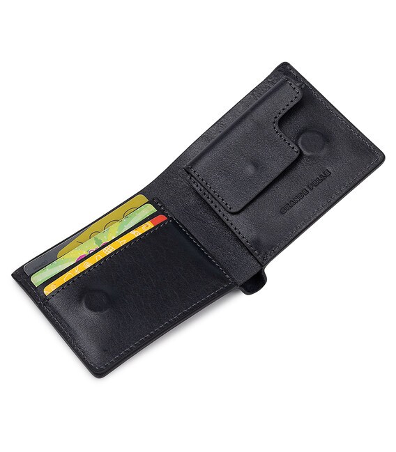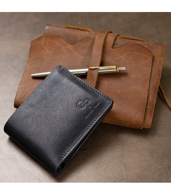 Практичне чоловіче портмоне в темно-синьому кольорі від українського виробника. Матеріал виготовлення - м'яка і приємна на дотик натуральна шкіра високого класу. Внутрішнє наповнення представлено у вигляді двох просторих відділень для купюр, слотів для пластикових карт і зручною монетницею на кнопці. Закривається портмоне на магніт.