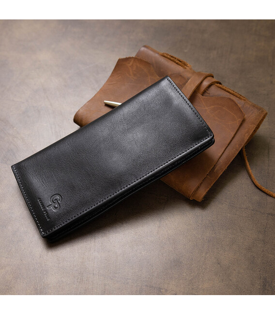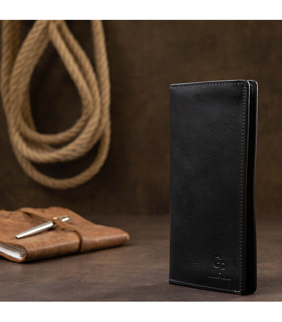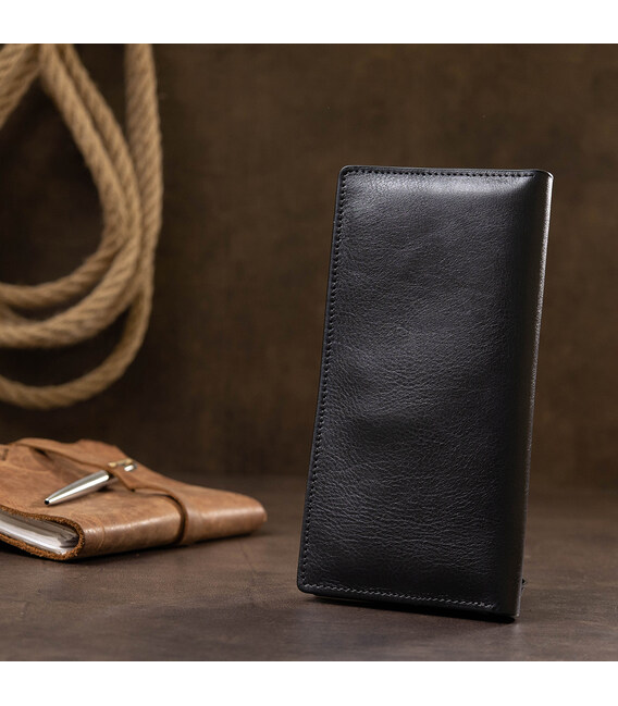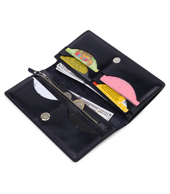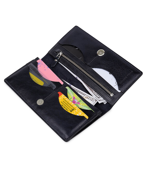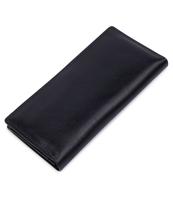 Відмінний гаманець з висококласної натуральної шкіри з гладкою глянсовою фактурою. Має універсальний темно-синій колір, тому підійде під будь-який гардероб. Внутрішнє наповнення представлено у вигляді містких відділень для банкнот, слотів для кредитних і візитних карток, а також монетниці на блискавці. Упакований аксесуар в фірмову коробку.