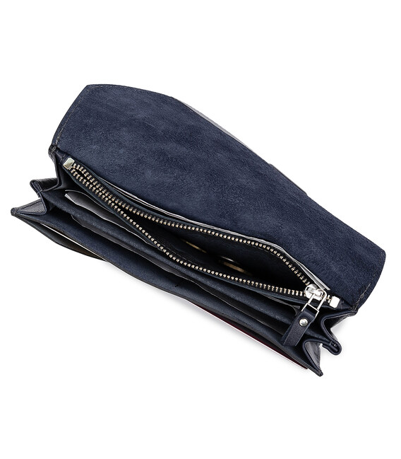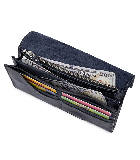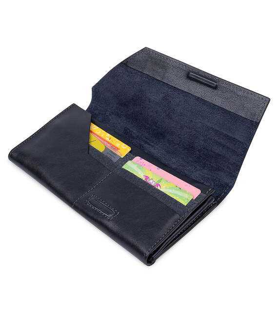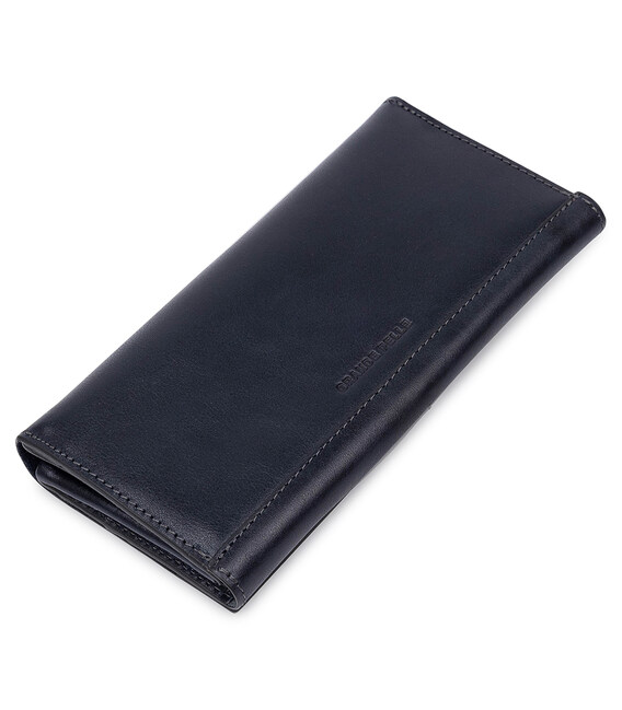 Шикарний гаманець в темно-синьому кольорі з натуральної шкіри, якість якої відчувається відразу, як тільки даний аксесуар потрапляє в руки. Усередині гаманця є місткі відділення для купюр, вісім слотів для пластикових і візитних карток, а також відділення на блискавці для монет або інших цінностей. Упаковано портмоне в фірмову коробку з картону.