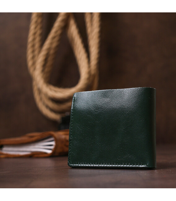 Сучасне портмоне в два складання від українського виробника. Виконано виріб з натуральної шкіри високого класу та покращеної міцності. Усередині є містке основне відділення для купюр, слоти для візитних та кредитних карток та компактна монетниця на кнопці для дрібниць. Колір виробу - зелений, гладка фактура з легким відливом.