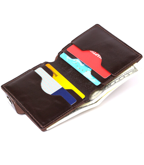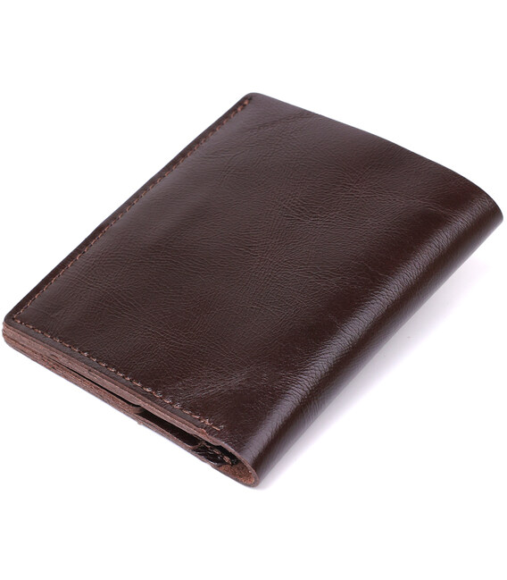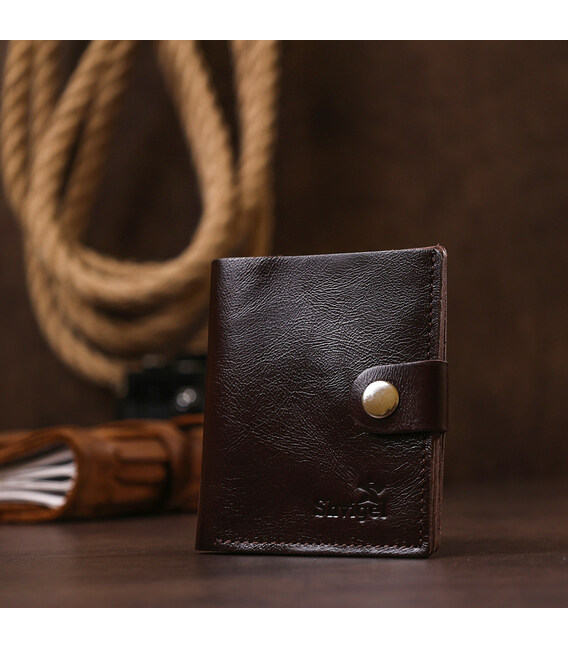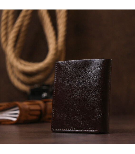 Суворе чоловіче портмоне у насиченому коричневому кольорі від українського виробника. Матеріал – натуральна шкіра високої якості та підвищеної зносостійкості. Всередині розташоване основне відділення для купюр і слоти для пластикових карток. Фактура аксесуара - гладка і дуже приємна на дотик.