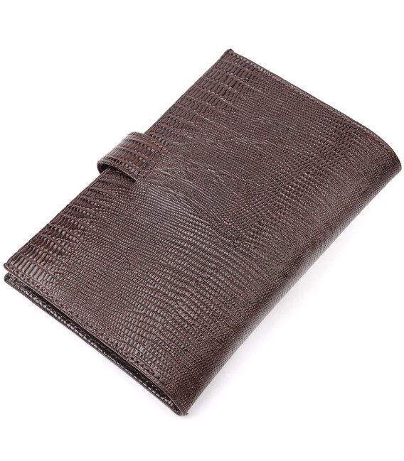 Зручний чоловічий гаманець із натуральної фактурної шкіри, з тисненням під рептилію. Модель вертикального типу складається навпіл і закривається хлястиком на кнопку. Короткий дизайн, відмінно лягає в руку, поміщається в будь-яку сумку. Аксесуар упакований у фірмову коробочку. Вироби з натуральної шкіри завжди будуть чудовим подарунком для близької людини.