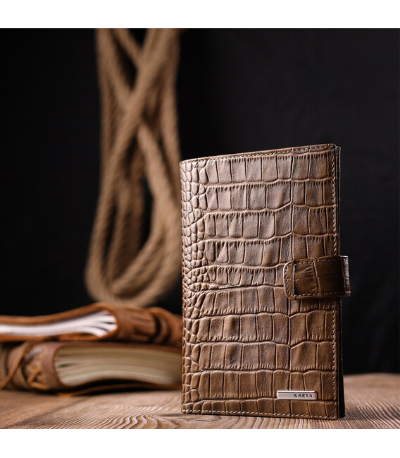Незвичайне чоловіче портмоне з хлястиком з натуральної шкіри з тисненням під крокодила KARYA 21196 Світло-коричневий