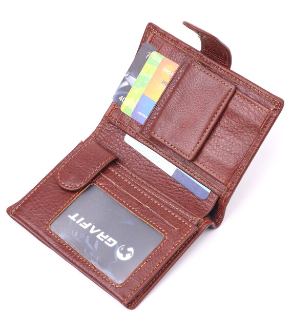 Вертикальне чоловіче портмоне із якісної натуральної шкіри, що закривається хлястиком на кнопку. Виріб складається з двох великих відділень для купюр, двох потайних кишень, трьох прозорих відділень, одинадцяти осередків для карток та монетниці на кнопці. Осередки для карт та прозорі відділення розташовуються в блоці, що закривається на хлястик з кнопкою. Закривається гаманець хлястиком на кнопку. Кожен сучасний чоловік оцінить усі переваги якісного гаманця із натуральної шкіри.