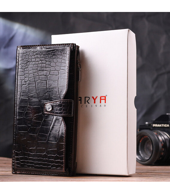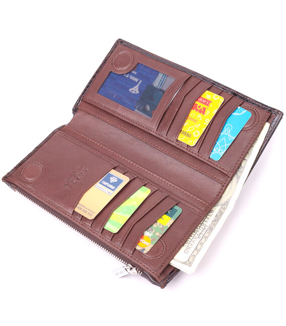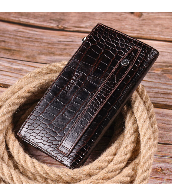 Гідний гаманець з натуральної фактурної шкіри, з тисненням під крокодила, у насиченому коричневому кольорі. Гаманець складається з одного глибокого відділення, чотирьох прилеглих кишень, дванадцяти осередків для карт, відділення під сіточкою, відділення на блискавці зовні та відділення для телефону, що закривається хлястиком на кнопку. У виробах цього елітного турецького бренду завжди використовуються найякісніші шкіряні матеріали та фурнітура. Аксесуар упакований у фірмову коробочку. Шкіряний виріб завжди буде чудовим подарунком для будь-якого чоловіка.