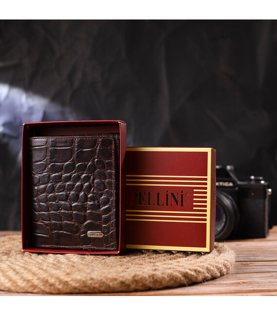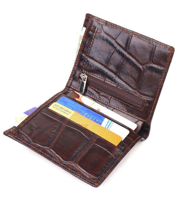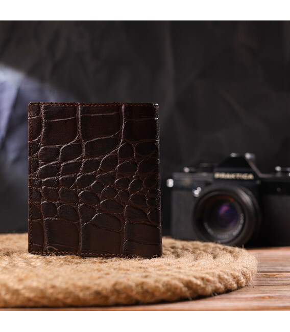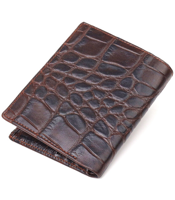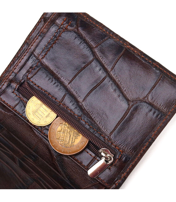 Оригінальне портмоне для чоловіків, із натуральної фактурної шкіри, з тисненням під крокодила. Аксесуар має одне основне відділення, з перегородкою, в яке поміщаються купюри всіх номіналів, три відсіки для карток, монетницю на блискавці з розширювачем, дві прилеглі кишені. На зовнішній стороні металевий логотип виробника. Колір фурнітури – срібло. Шкіряний гаманець є справді потрібним подарунком на всі випадки життя.