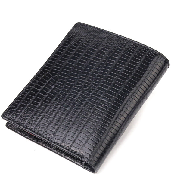 Комбіноване чоловіче портмоне, з натуральної фактурної шкіри, з тисненням під рептилію, у класичному чорному кольорі зовні та червоному кольорі – усередині. Аксесуар має одне основне відділення, з перегородкою, в яке поміщаються купюри всіх номіналів, три відсіки для карток, монетницю на блискавці з розширювачем, дві прилеглі кишені. На зовнішній стороні металевий логотип виробника. Колір фурнітури – срібло. Шкіряний гаманець є справді потрібним практичним подарунком.