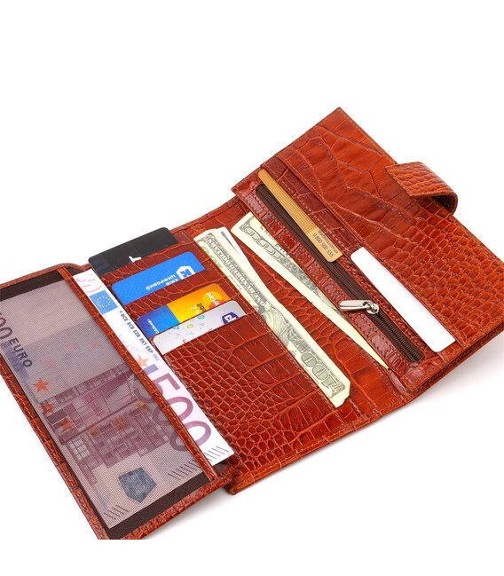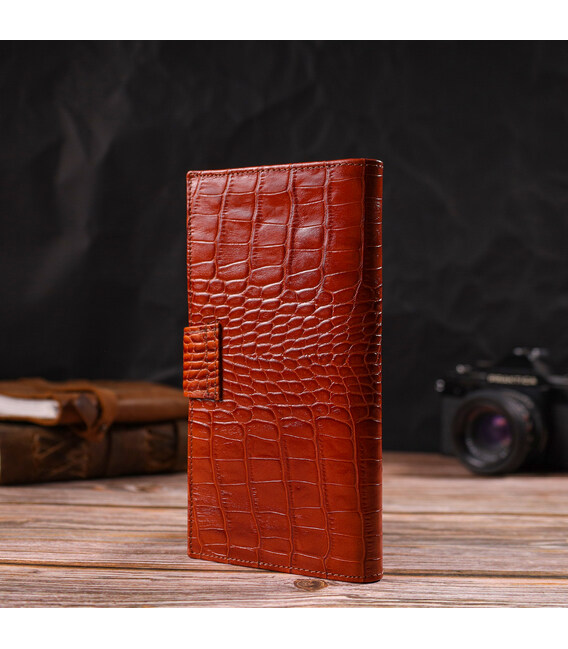 Дуже красивий вертикальний чоловічий гаманець із натуральної фактурної шкіри із тисненням під крокодила. Аксесуар має одне основне відділення, в яке розміщуються купюри всіх номіналів, п'ятнадцять кишень для карток, кишеня під сіточкою для документів, дві прилеглі кишені та монетницю. Закривається аксесуар навпіл шкіряним хлястиком на кнопку. Запакований гаманець картонну коробку.