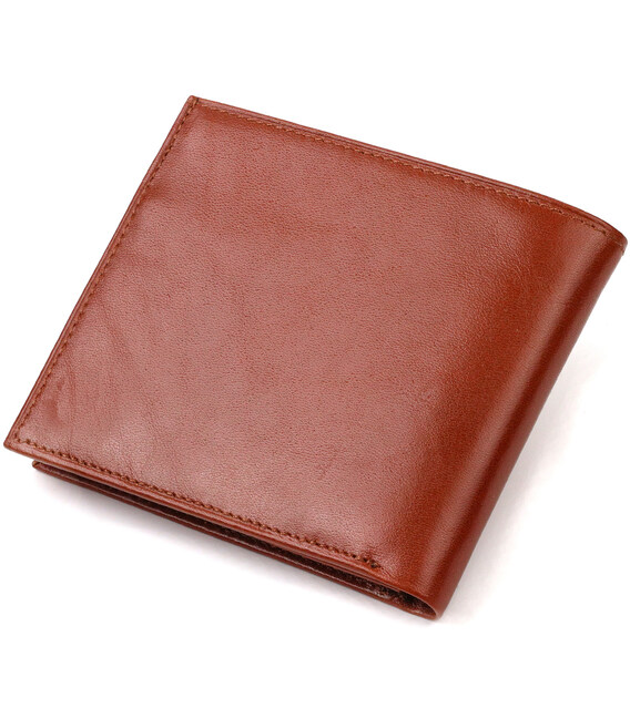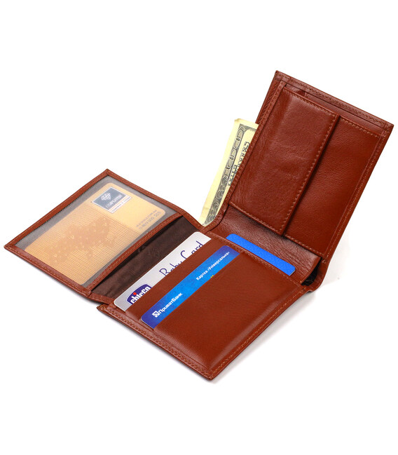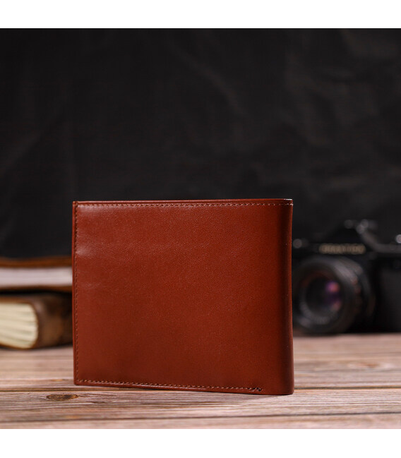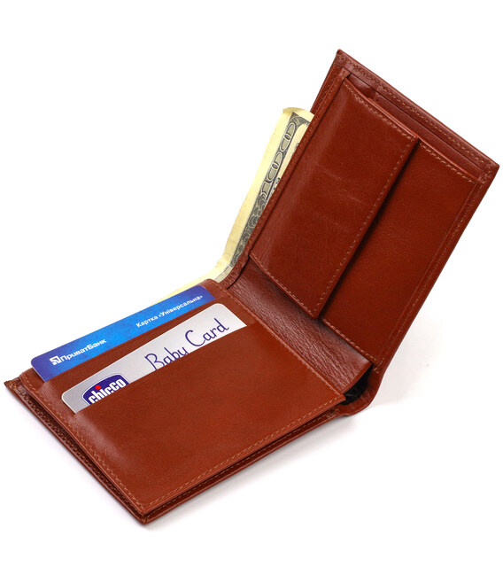 Практичний чоловічий гаманець із натуральної гладкої шкіри. Аксесуар має одне основне відділення з тканинною перегородкою, в яке поміщаються купюри всіх номіналів, шість кишень для карток, кишеня під сіточкою для пропуску, одна прихована кишеня і монетницю. Закривається аксесуар навпіл, без застібки. На лицьовій стороні, у правому нижньому куті металевий логотип компанії виробника. Купуючи шкіряний аксесуар цієї фірми, собі чи на подарунок, будьте певні, що він прослужить Вам не один рік.
