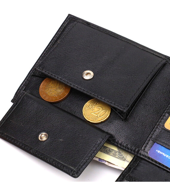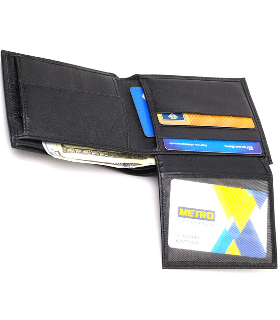 Місткий чоловічий гаманець із натуральної гладкої шкіри. Аксесуар має одне основне відділення з тканинною перегородкою, в яке поміщаються купюри всіх номіналів, шість кишень для карток, кишеня під сіточкою для пропуску, одна прихована кишеня і монетницю. Закривається аксесуар навпіл, без застібки. На лицьовій стороні, у правому нижньому куті металевий логотип компанії виробника. Купуючи шкіряний аксесуар цієї фірми, собі чи на подарунок, будьте певні, що він прослужить Вам не один рік.