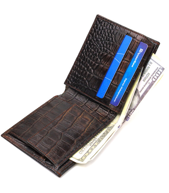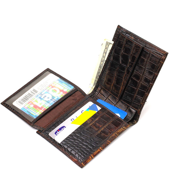 Місткий чоловічий гаманець із натуральної фактурної шкіри, з тисненням під крокодила, в оригінальному кольорі. Аксесуар має одне основне відділення з тканинною перегородкою, в яке поміщаються купюри всіх номіналів, шість кишень для карток, кишеня під сіточкою для пропуску, одна прихована кишеня і монетницю. Закривається аксесуар навпіл, без застібки. На лицьовій стороні, у правому нижньому куті металевий логотип компанії виробника. Купуючи шкіряний аксесуар цієї фірми, собі чи на подарунок, будьте певні, що він прослужить Вам не один рік.