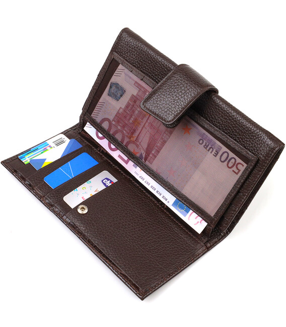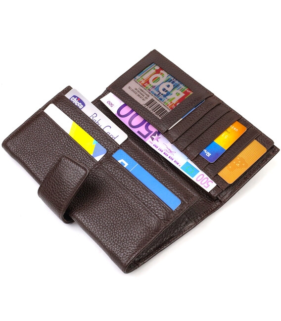 Чудовий чоловічий гаманець-клатч із натуральної шкіри з тисненням під рептилію. Аксесуар має одне основне відділення з тканинною перегородкою на блискавці, вісімнадцять кишень для карток, кишеню під сіточкою для пропуску, дві приховані кишені та монетницю. Закривається аксесуар у два складання хлястиком на кнопку. На лицьовій стороні, у правому нижньому куті металевий логотип компанії виробника. Купуючи шкіряний аксесуар цієї фірми, собі чи на подарунок, будьте певні, що він прослужить Вам не один рік.