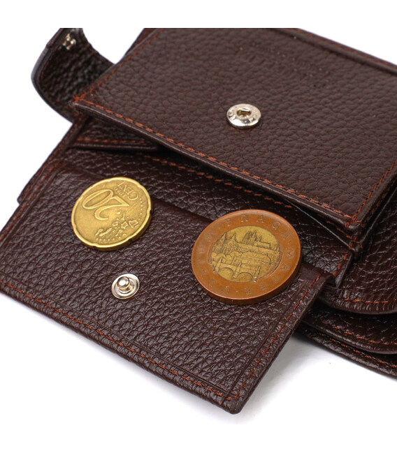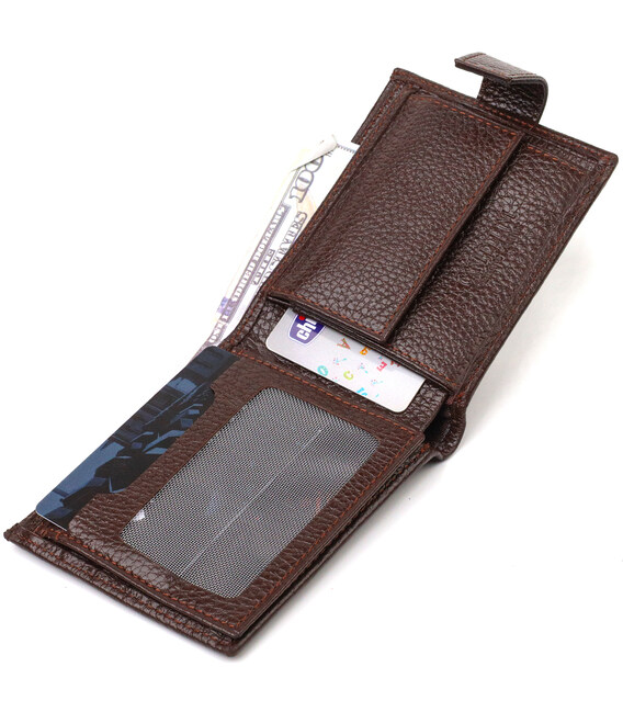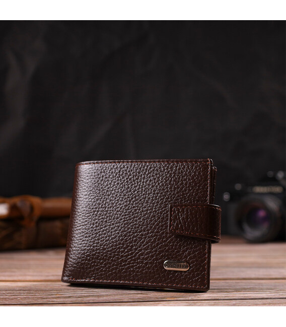 Чоловіче портмоне невеликого розміру із натуральної зернистої шкіри. Аксесуар має основне відділення для купюр з перегородкою, три осередки для карток, дві кишені під сіточкою, дві прилеглі кишені та монетницю. Гаманець складається навпіл, закривається хлястиком на кнопку. На лицьовій стороні в правому нижньому кутку розташований металевий логотип компанії виробника. Багатофункціональний чоловічий гаманець з дуже міцної шкіри чудовий вибір подарунка для солідного чоловіка.