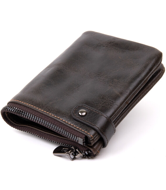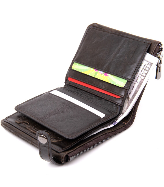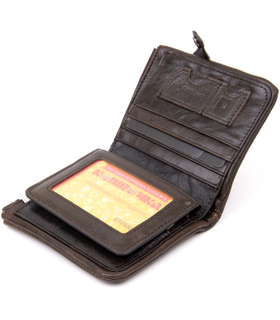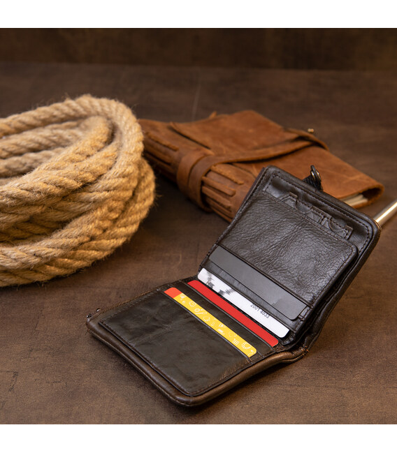Тонке компактне портомне з натуральної шкіри з хлястиком на кнопці, закривається портмоне зверху. Виріб має велику кишеню на блискавці для купюр. Усередині досить осередків для кредиток. Виріб продумано для сучасної людини. Яка віддає перевагу карткам і носить мінімум готівки. Виріб має червонуватий блискучий відтінок. Оригінальний аксесуар вигідно виділить вас з натовпу.