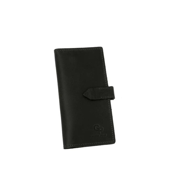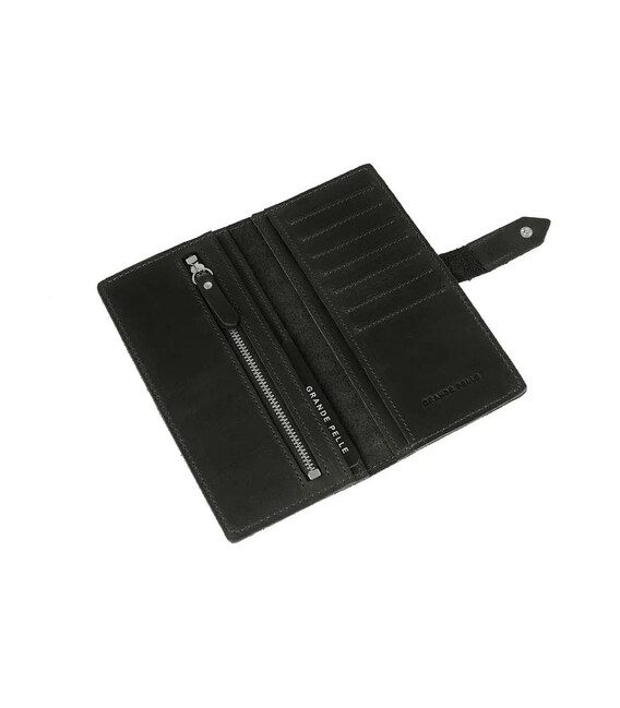 Портмоне чоловіче довге Grande Pelle 523110 чорне з хлястиком на кнопці. 4 слоти під купюри, 7 слотів під карти, монетниця на блискавці на всю довжину.