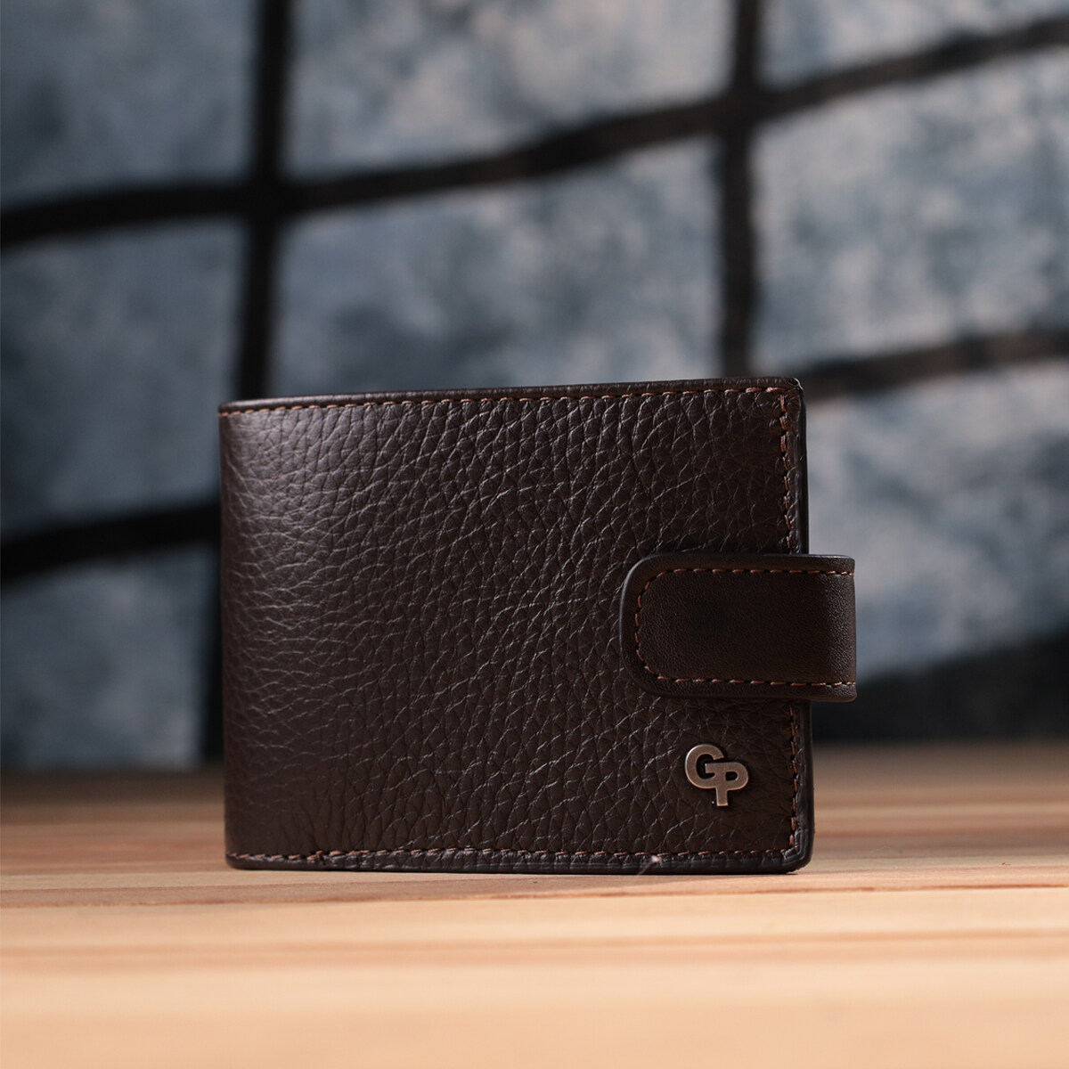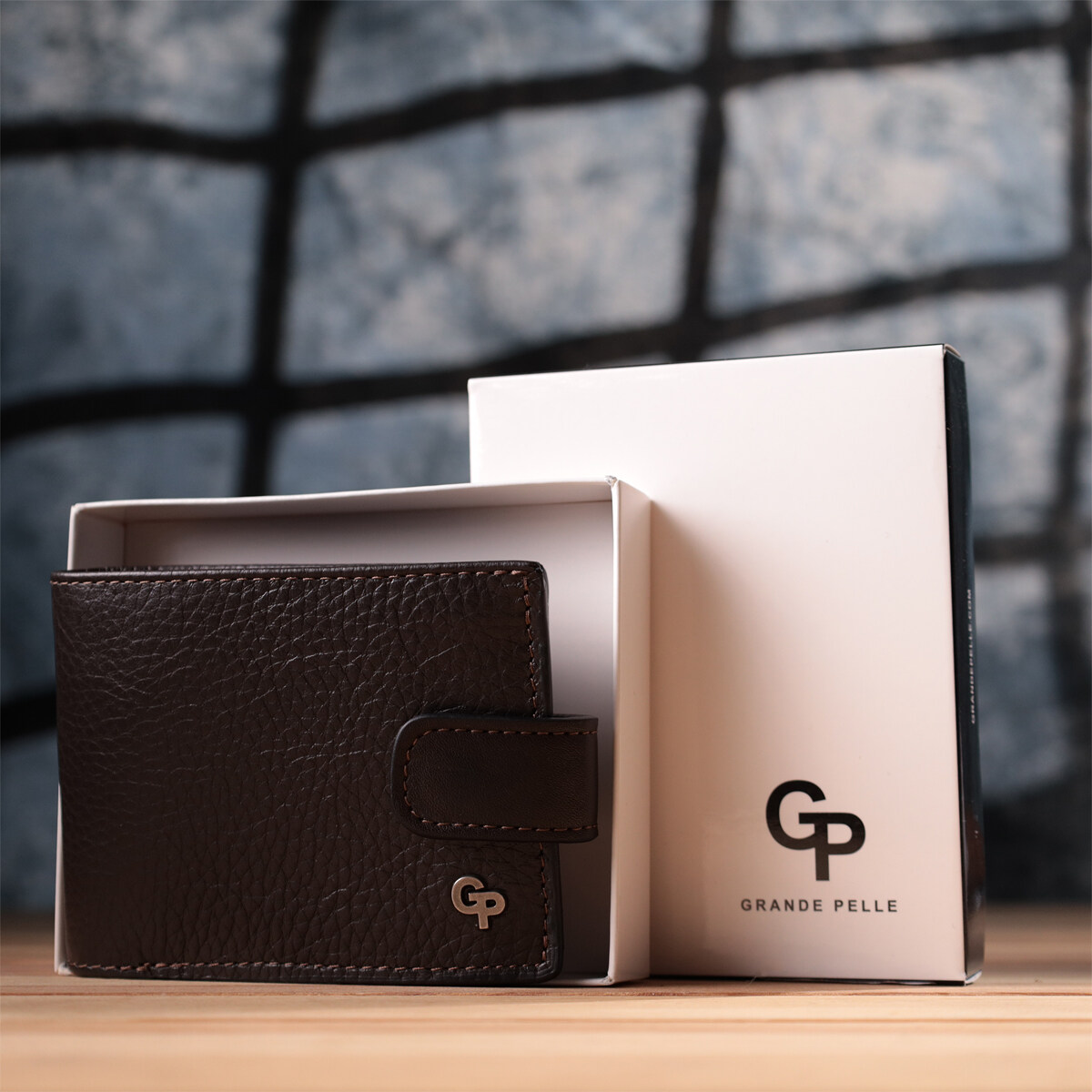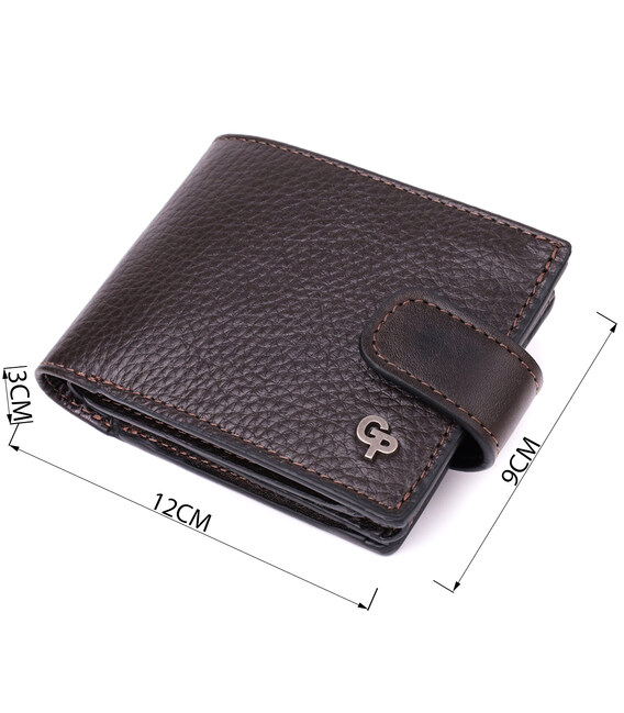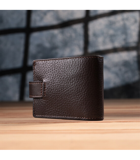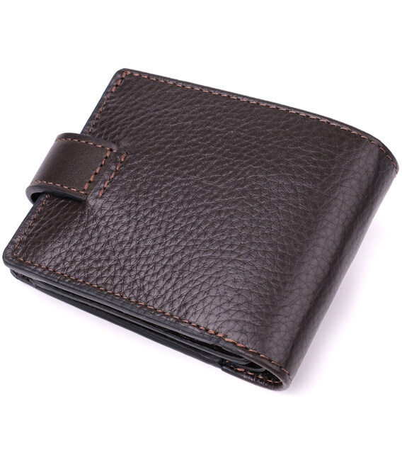 Містке портмоне для чоловіків з натуральної шкіри флотар зі вставками з гладкої шкіри. Портмоне у класичному стилі завжди залишається на піку популярності. Дизайн гаманця продуманий так, щоб він був максимально зручним та містким, при цьому залишаючись компактним. Аксесуар закривається на шкіряний хлястик із кнопкою. На лицьовій стороні, в правому нижньому кутку, розташований металевий логотип компанії виробника, що є запорукою високої якості. Виріб виконаний у коричневому кольорі з акуратним рядком, що підкреслює його елегантний зовнішній вигляд. Модель упакована у фірмову картонну коробку, яка може замінити подарункову упаковку. Портмоне стане чудовим рішенням для подарунка близькій людині.