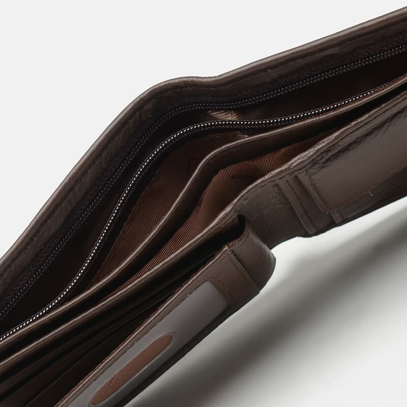 Практична модель гаманця з натуральної шкіри. Функціонал: 3 відділення для банкнот (одне з яких на блискавці), кишеню на кнопці для монет, 3 слота для карт, прозора кишеня для фото або прав і 2 потаємних кишені. Підкладка: текстиль. Портмоне надійно закривається на кнопку.