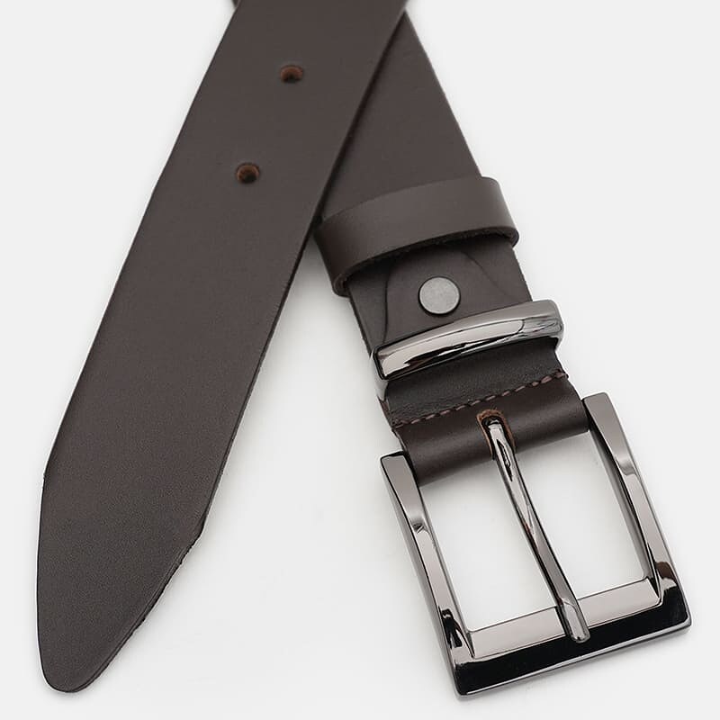 Чоловічий шкіряний ремінь. Якісні матеріали, стильна пряжка та акуратний зовнішній вигляд. Ремінь виконаний з натуральної шкіри та металевої фурнітури. Лицьова сторона ременя захищена від вологи, жиру та агресивних середовищ. Догляд – мінімальний (сухе чищення). При необхідності, ремінь можна вкоротити самостійно до потрібної довжини.