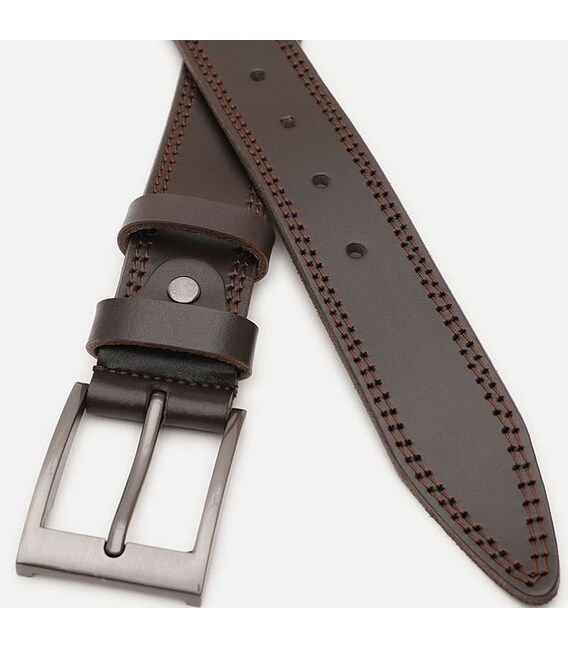 Чоловічий шкіряний ремінь. Якісні матеріали, стильна пряжка та акуратний зовнішній вигляд. Ремінь виконаний із натуральної української шкіри та металевої фурнітури. Лицьова сторона ременя захищена від вологи, жиру та агресивних середовищ. Догляд – мінімальний (сухе чищення). При необхідності, ремінь можна вкоротити самостійно до потрібної довжини.