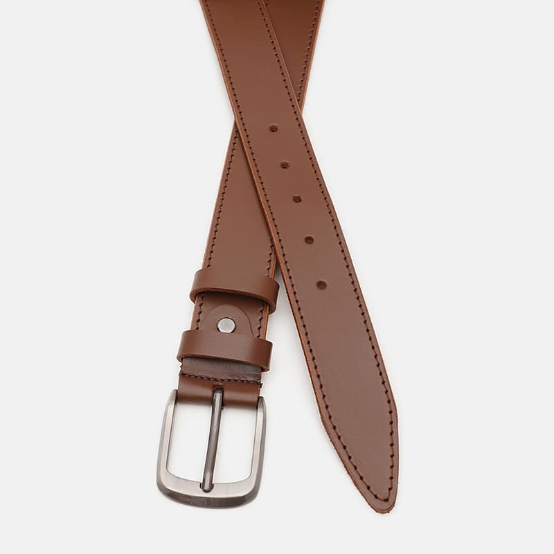 Чоловічий шкіряний ремінь. Якісні матеріали, стильна пряжка та акуратний зовнішній вигляд. Ремінь виконаний із натуральної української шкіри та металевої фурнітури. Лицьова сторона ременя захищена від вологи, жиру та агресивних середовищ. Догляд – мінімальний (сухе чищення). При необхідності, ремінь можна вкоротити самостійно до потрібної довжини.