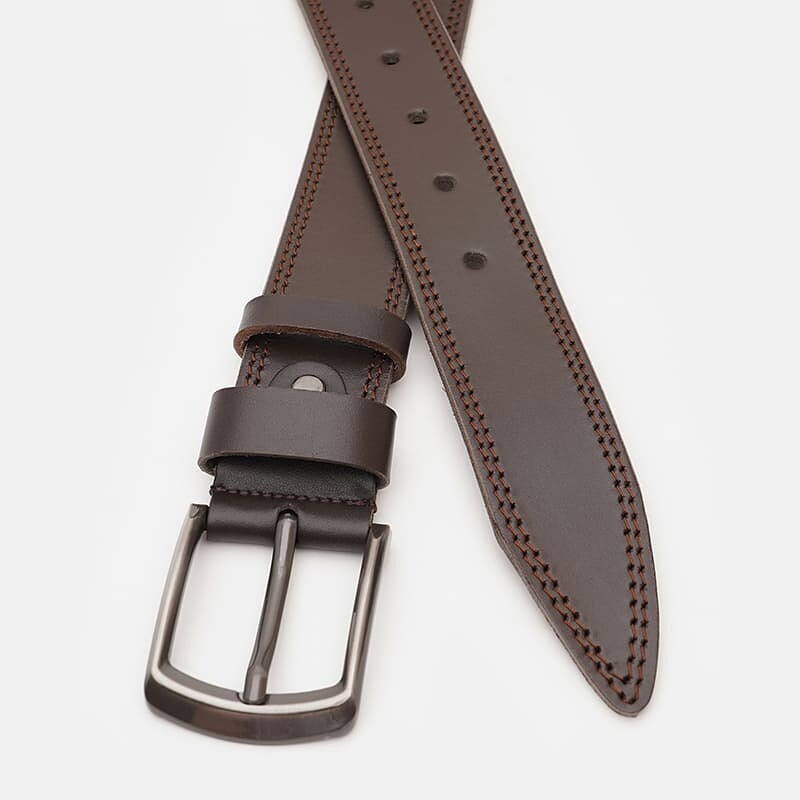 Чоловічий шкіряний ремінь. Якісні матеріали, стильна пряжка та акуратний зовнішній вигляд. Ремінь виконаний із натуральної української шкіри та металевої фурнітури. Лицьова сторона ременя захищена від вологи, жиру та агресивних середовищ. Догляд – мінімальний (сухе чищення). При необхідності, ремінь можна вкоротити самостійно до потрібної довжини.