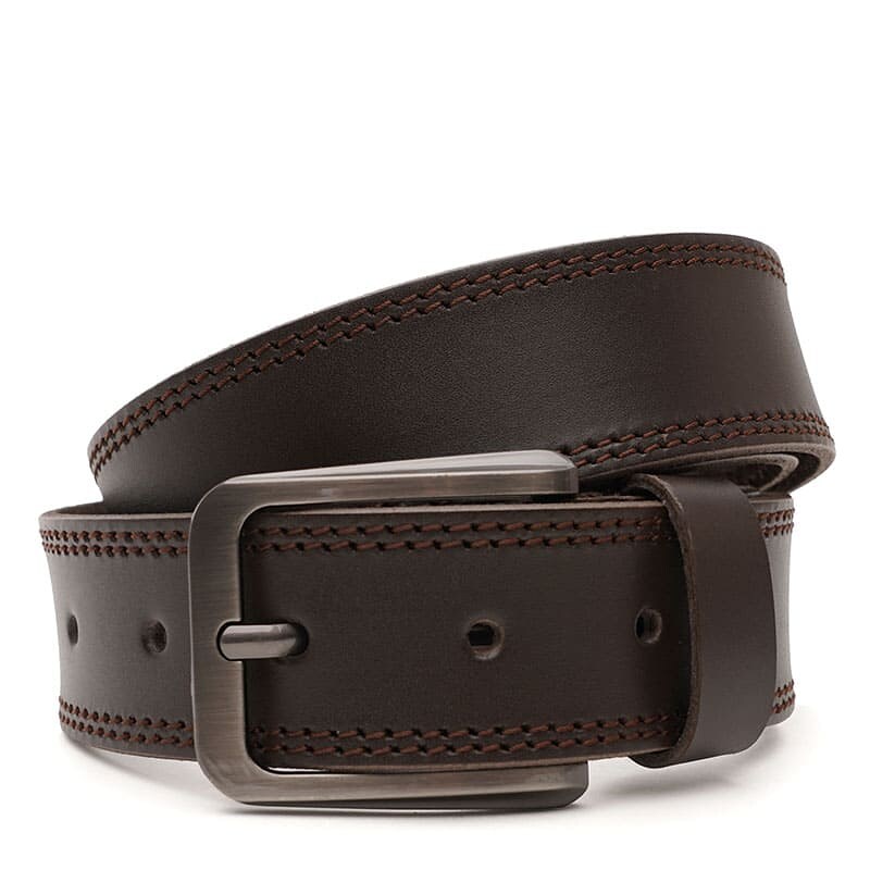 Чоловічий шкіряний ремінь. Якісні матеріали, стильна пряжка та акуратний зовнішній вигляд. Ремінь виконаний із натуральної української шкіри та металевої фурнітури. Лицьова сторона ременя захищена від вологи, жиру та агресивних середовищ. Догляд – мінімальний (сухе чищення). При необхідності, ремінь можна вкоротити самостійно до потрібної довжини.