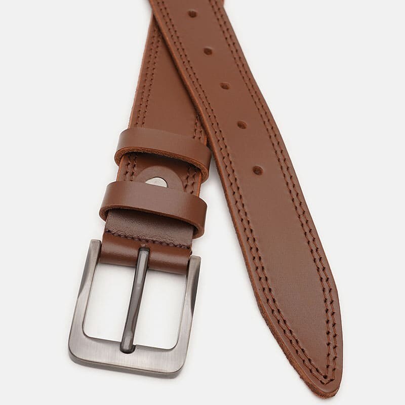 Чоловічий шкіряний ремінь. Якісні матеріали, стильна пряжка та акуратний зовнішній вигляд. Ремінь виконаний із натуральної української шкіри та металевої фурнітури. Лицьова сторона ременя захищена від вологи, жиру та агресивних середовищ. Догляд – мінімальний (сухе чищення). При необхідності, ремінь можна вкоротити самостійно до потрібної довжини.