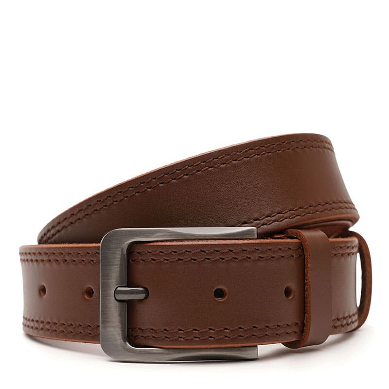 Чоловічий шкіряний ремінь. Якісні матеріали, стильна пряжка та акуратний зовнішній вигляд. Ремінь виконаний із натуральної української шкіри та металевої фурнітури. Лицьова сторона ременя захищена від вологи, жиру та агресивних середовищ. Догляд – мінімальний (сухе чищення). При необхідності, ремінь можна вкоротити самостійно до потрібної довжини.