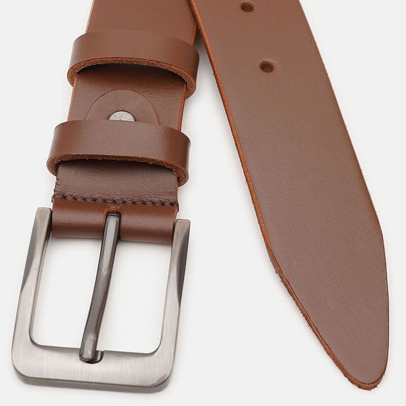Чоловічий шкіряний ремінь. Якісні матеріали, стильна пряжка та акуратний зовнішній вигляд. Ремінь виконаний із натуральної української шкіри та металевої фурнітури. Лицьова сторона ременя захищена від вологи, жиру та агресивних середовищ. Догляд – мінімальний (сухе чищення). При необхідності, ремінь можна вкоротити самостійно до потрібної довжини.