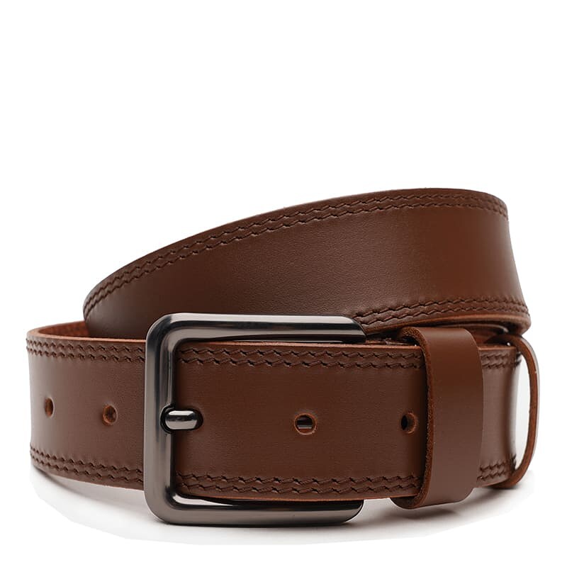 Чоловічий шкіряний ремінь. Якісні матеріали, стильна пряжка та акуратний зовнішній вигляд. Ремінь виконаний із натуральної української шкіри та металевої фурнітури. Лицьова сторона ременя захищена від вологи, жиру та агресивних середовищ. Догляд – мінімальний (сухе чищення). При необхідності, ремінь можна вкоротити самостійно до потрібної довжини.