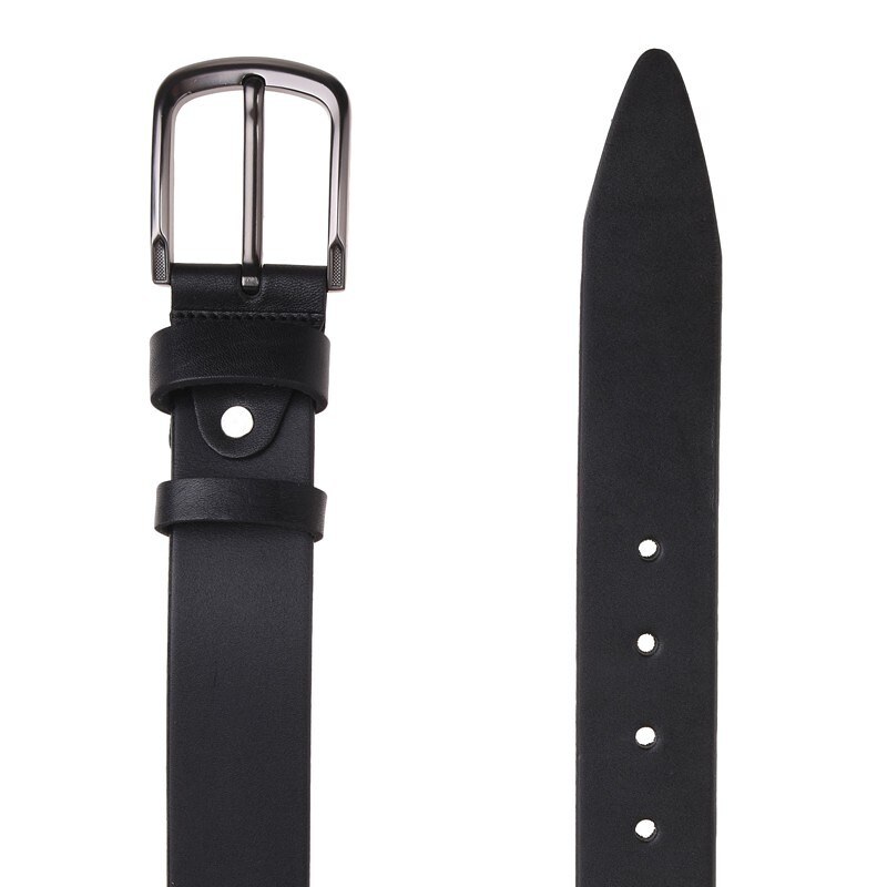 Чоловічий шкіряний ремінь. Якісні матеріали, стильна металева пряжка і акуратний зовнішній вигляд. Ремінь виконаний з натуральної телячої шкіри та металевої фурнітури. Лицьова сторона ременя захищена від вологи, жиру і агресивних середовищ. Догляд - мінімальний, при необхідності (суха чистка).