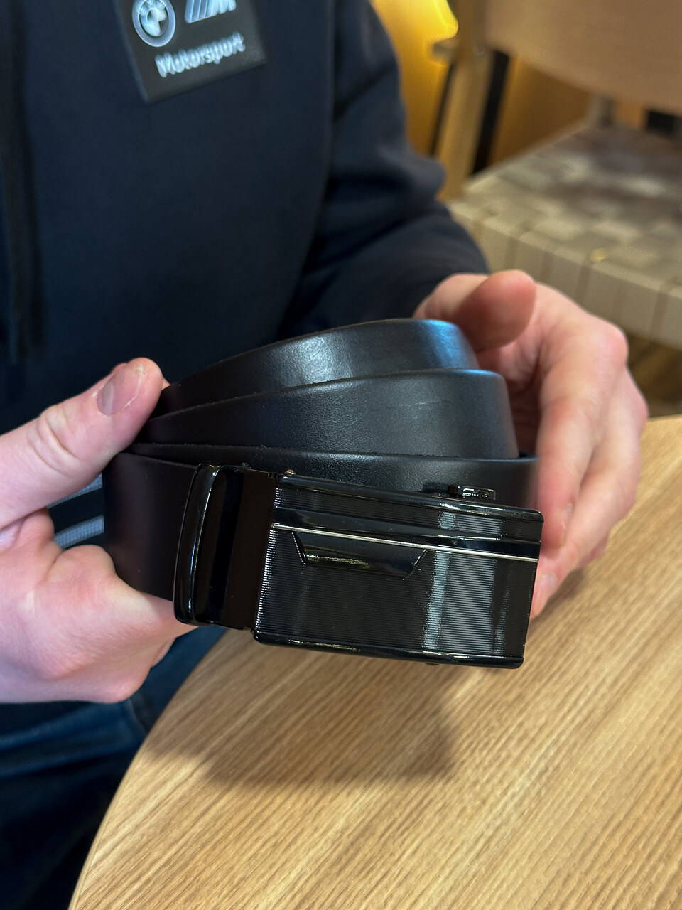 Чоловічий шкіряний ремінь. Якісні матеріали, стильна пряжка та акуратний зовнішній вигляд. Ремінь виконаний з натуральної шкіри та металевої фурнітури. Купуючи шкіряний ремінь, ви вже дуже заощаджуєте, адже він прослужить вам роки. За потреби ремінь можна вкоротити під свій розмір. Лицьова сторона ременя захищена від вологи, жиру та агресивних середовищ. Догляд – мінімальний (сухе чищення).