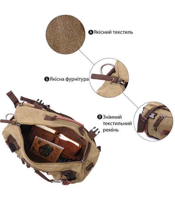 Багатофункціональний рюкзак трансформер із щільного текстилю. Модель можна носити як сумку, і рюкзак. Аксесуар має бічні регулятори і може розширюватися обсяг залежно від забитости сумки. Виріб має достатній об'єм кишень, щоб Ви легко помістили всі свої особисті речі. Сумка виконана з якісного та міцного текстилю. Виріб стане гідною заміною, якщо ви не бажаєте переплачувати за моделі з натуральної шкіри.