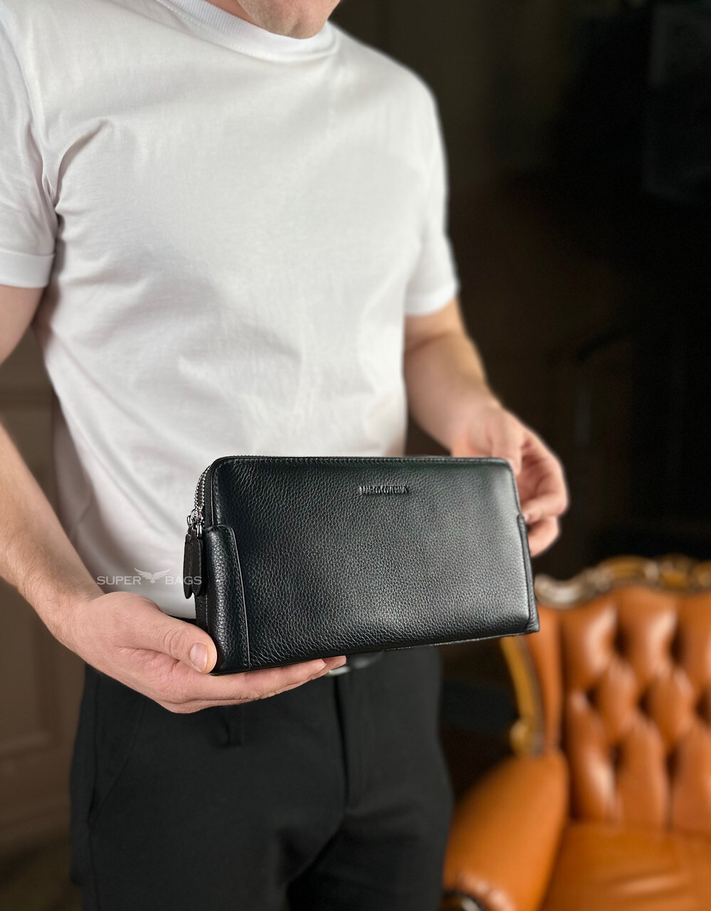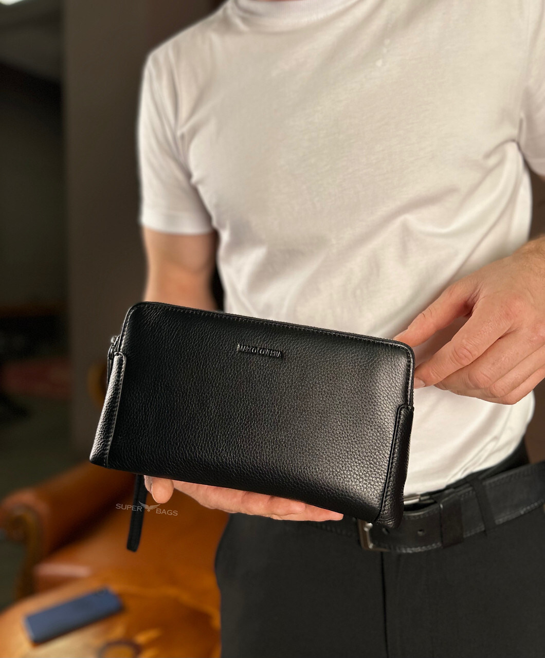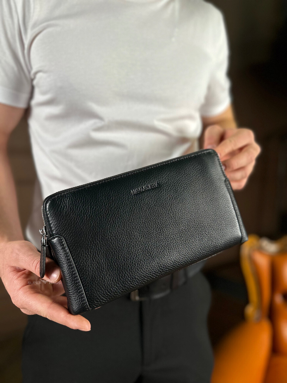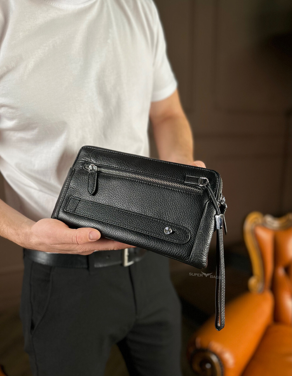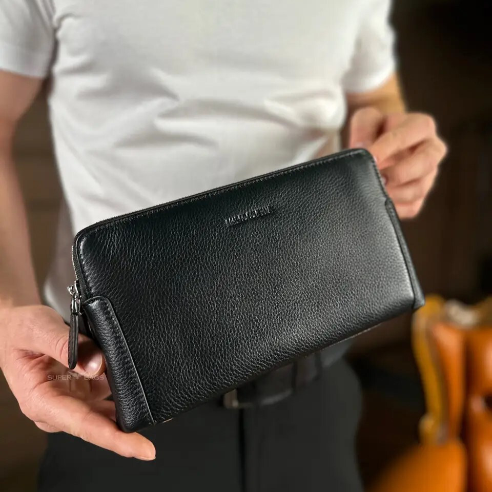 Чоловічий гаманець з натуральної шкіри підійде тим, хто цінує і стиль, і практичність. Модель має два окремі відділення на блискавці. Як в одному, так і в другому зручно тримати банкноти, а також розподіляти їх за номіналом. Додаткові суми (або чеки) можна відкладати у прилеглих кишенях. Для монет підходять кишені на блискавці, що служать перегородками. Також є комірки для кредитних карток. До того ж там є фіксатор для ручки. Завдяки двом ременям (на долоню та зап'ястя) аксесуар перетворюється або в портмоне, або в клатч.