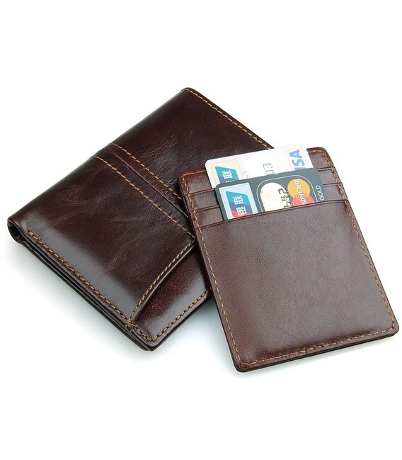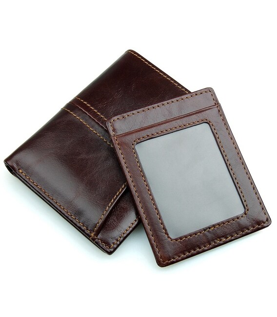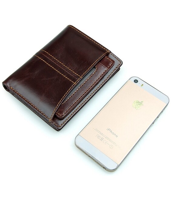 Сучасний чоловічий шкіряний гаманець коньячного кольору. Шкіра має легкий, ледь помітний глянець. Аксесуар акуратно прошитий надміцною ниткою світло-коричневого кольору. На зовнішній стороні розташована накладна кишеня. Разом з гаманцем поставляється шкіряна кредитниця. Її можна використовувати як окремий аксесуар. Гаманець упакований в пилозахисний текстильний мішечок.
