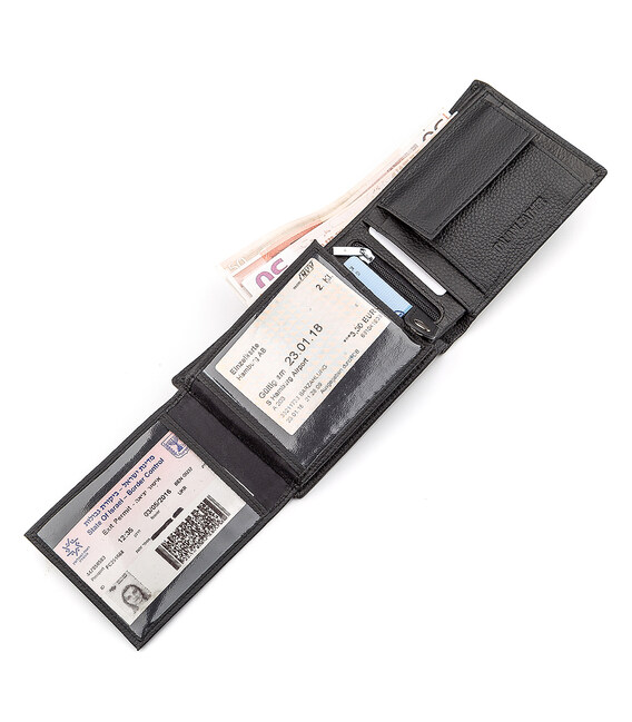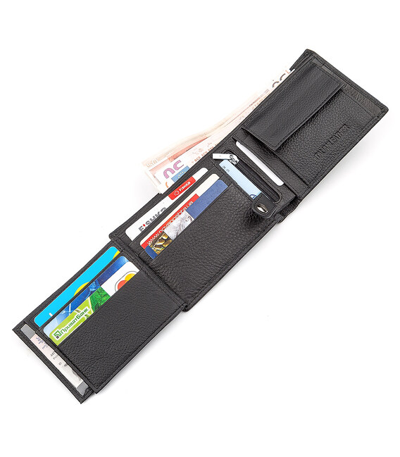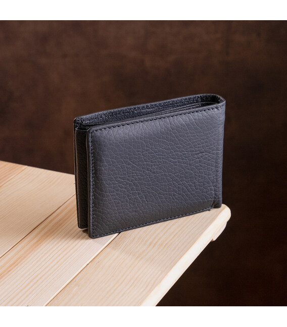 Аксесуар відрізняється середніми розмірами. Він має додатковий відсік, який фіксується кнопкою. У гаманці є спеціальні відділи для карток і пару прозорих слотів для водійських посвідчень. Для зберігання банкнот передбачено 3 кишеньки, одну з яких можна закрити. Виконано гаманець з натурального матеріалу. Перегородки в виробі виготовлені з текстилю. Упакований гаманець в привабливу подарункову упаковку від виробника.