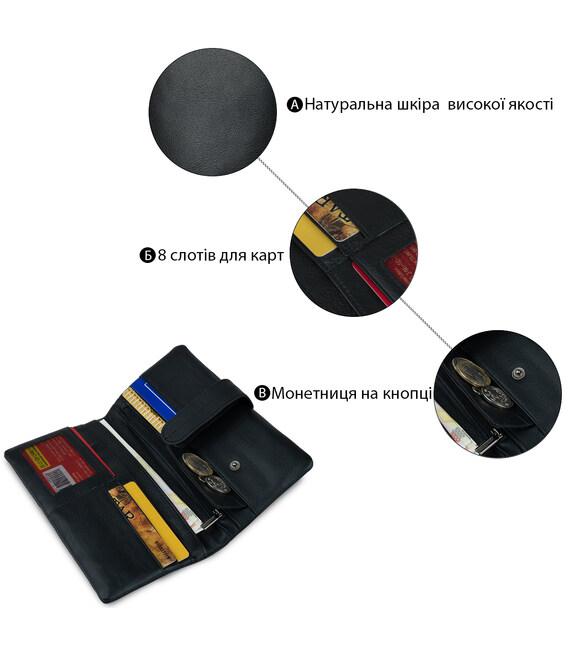 Всередині аксесуар шкіряний в поєднанні з текстилем. Місткий вертикальний гаманець спокійно поміститься в вашу сумку і відмінно підійде до вашого образу. Дизайн гаманця виготовлений в класичному стилі і продуманий до дрібниць для вашої зручності. Гаманець доповнений різноманітними кишенями, щоб ваші речі не плуталися і не заважали. По краях аксесуар прошитий чорним рядком в тонах аксесуара.