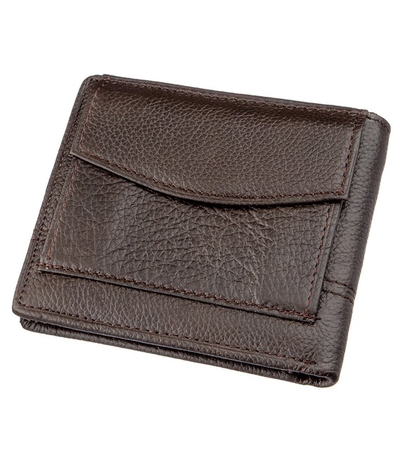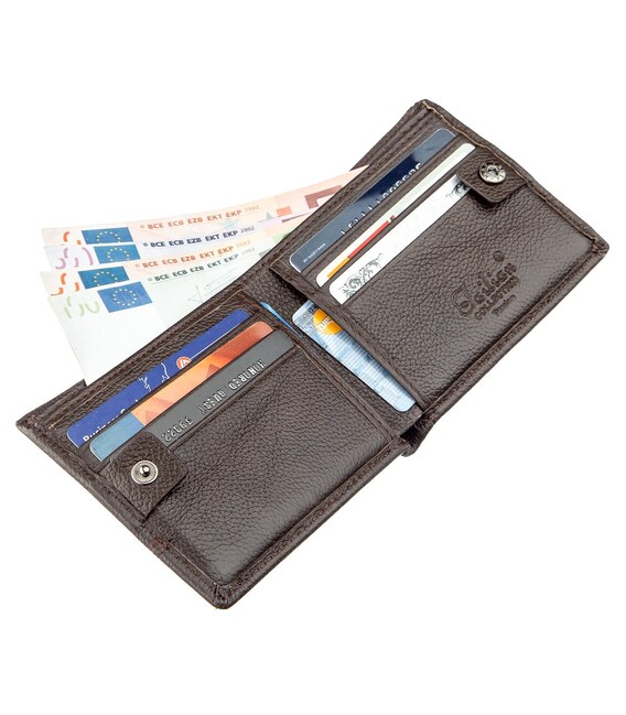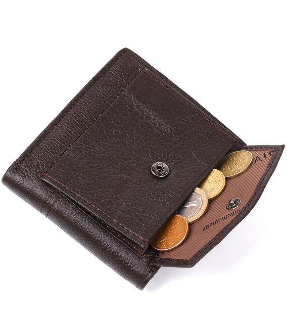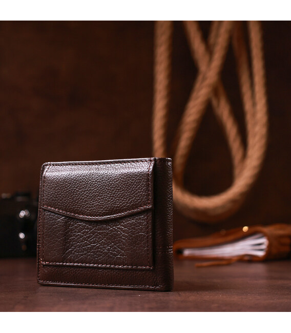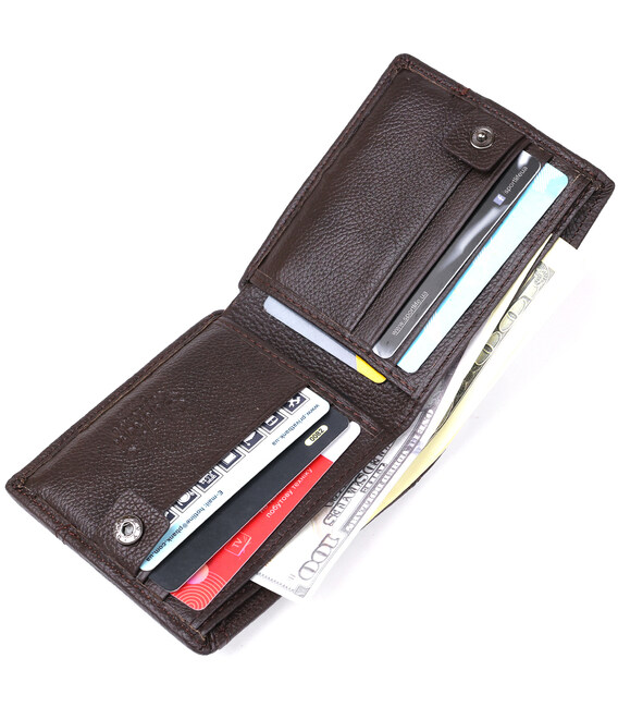 Класичний гаманець з натуральної шкіри темно-коричневого кольору. Аксесуар виконаний із зернистої шкірі. М'який і приємний на дотик і доповнений усім необхідним функціоналом. Аксесуар закривається на кнопку. На зовнішній стороні металевий логотип бренду. Усередині гаманець доповнений просторими відділеннями для купюр, слотами для карток і відділення для купюр на блискавки. Портмоне закривається на хлястик з кнопкою. Легко поміститься в невелику сумку або кишеню брюк. У комплекті йде картонна жовта коробка.
