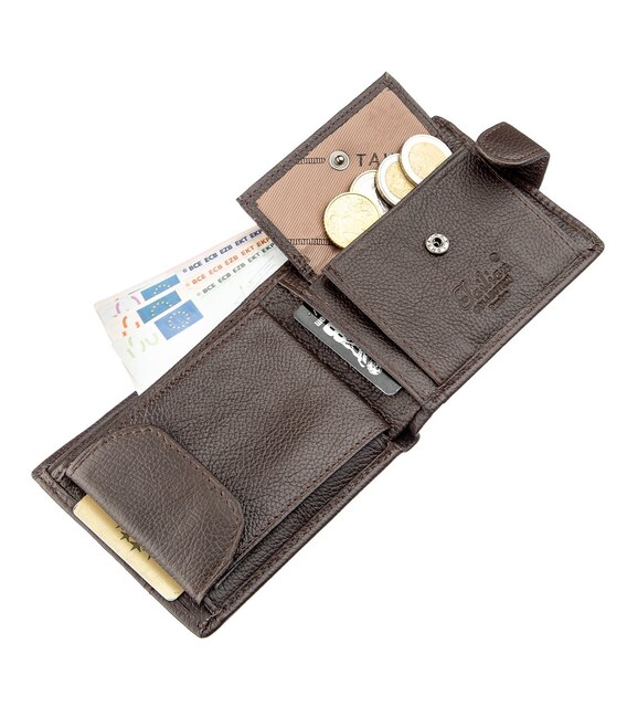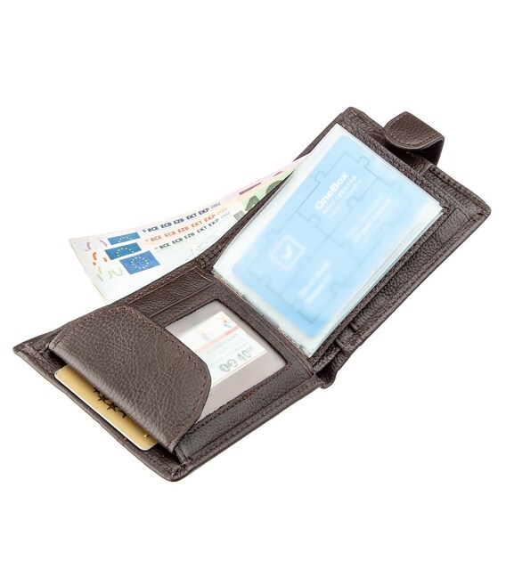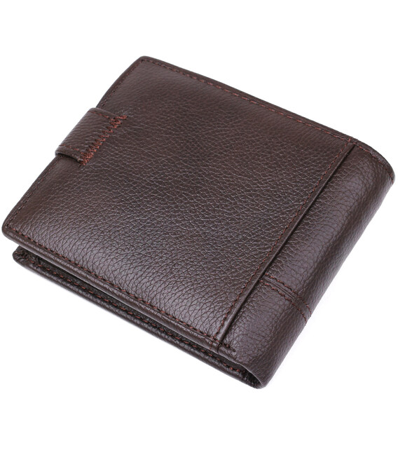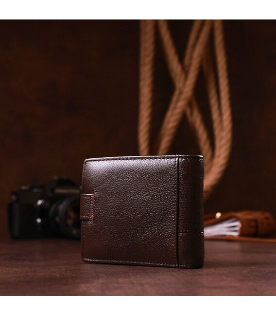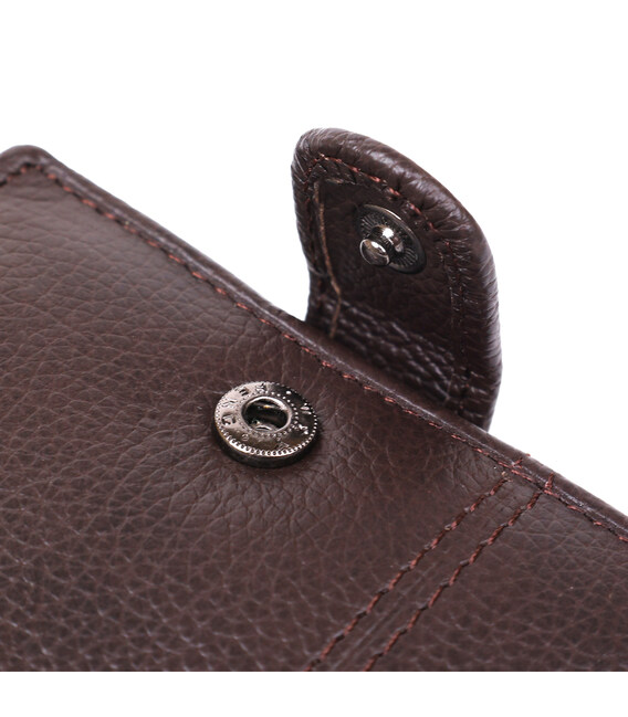 Модель гаманця - класика коричневого кольору. Відмінною особливістю даного гаманця є те, що в нього вбудована візитниця, яка закривається на хлястик з кнопкою. Усередині гаманець виконаний з натуральної шкіри в поєднанні з міцним текстилем. Закривається гаманець на хлястик з кнопкою. У комплекті йде картонна коробка жовтого кольору.