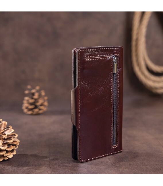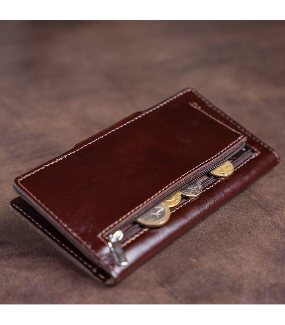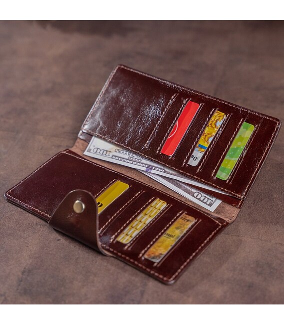 Гаманець з натуральної шкіри класичного коричневого кольору. Застібається на хлястик з кнопками. Модель має глянсове покриття. Досить оригінально виглядає. Багатий зовнішній вигляд. Зверху прошита рівним рядком в дизайн виробу. Має строгий витриманий дизайн в класичному стилі. Ідеально підійде для тих, хто любить стиль і оригінальність. Не займає багато місця у вашій сумці. Тонкий і одночасно місткий. Буде чудовим подарунком. Гаманець має високу зносостійкість до потертості і тріщин. Модель доступна в різних кольорах і типах шкіри. Ми впевнені, що гаманець здивує свого власника.