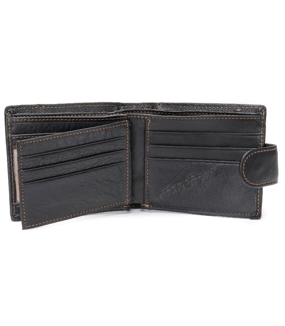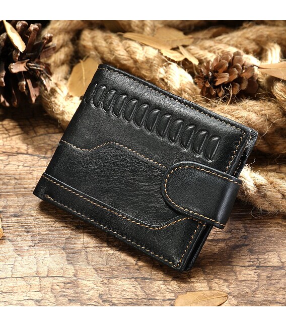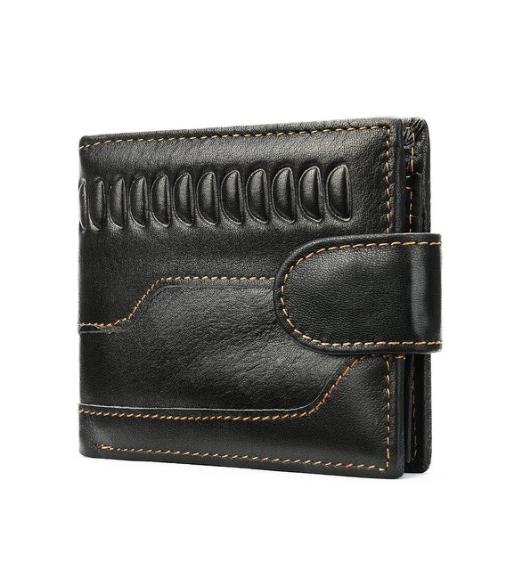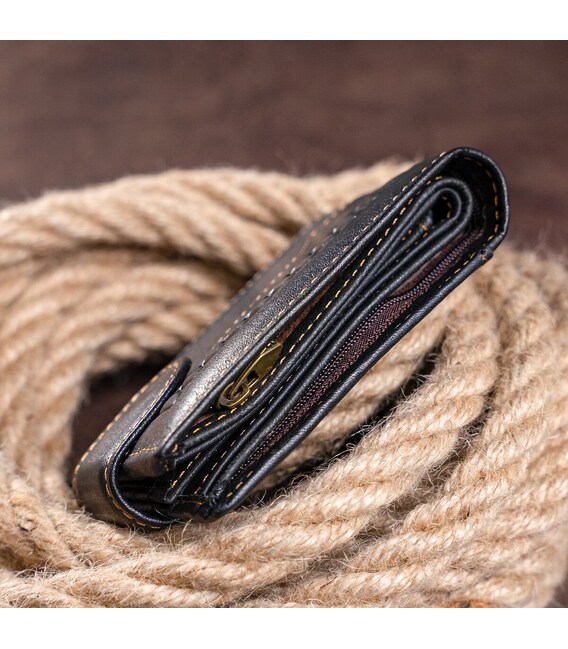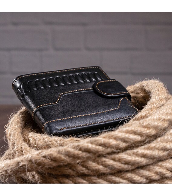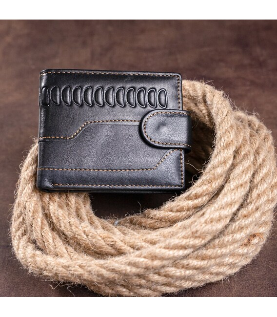 Функціональний та стильний гаманець для чоловіків з тисненням. Аксесуар з натуральної шкіри. Компактний гаманець легко поміститься в вашу сумку або кишеню. По краях модель прошита світлою ниткою. Виріб закривається на шкіряний хлястик з кнопкою. Гаманець прекрасно підійде на подарунок для чоловіків.