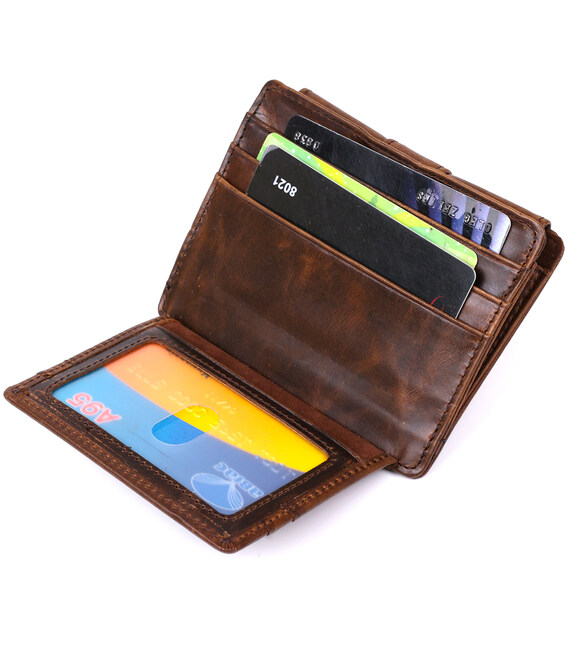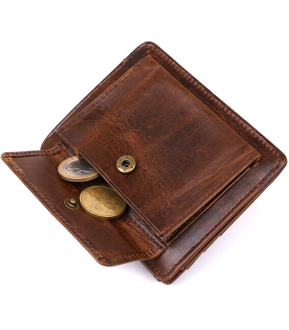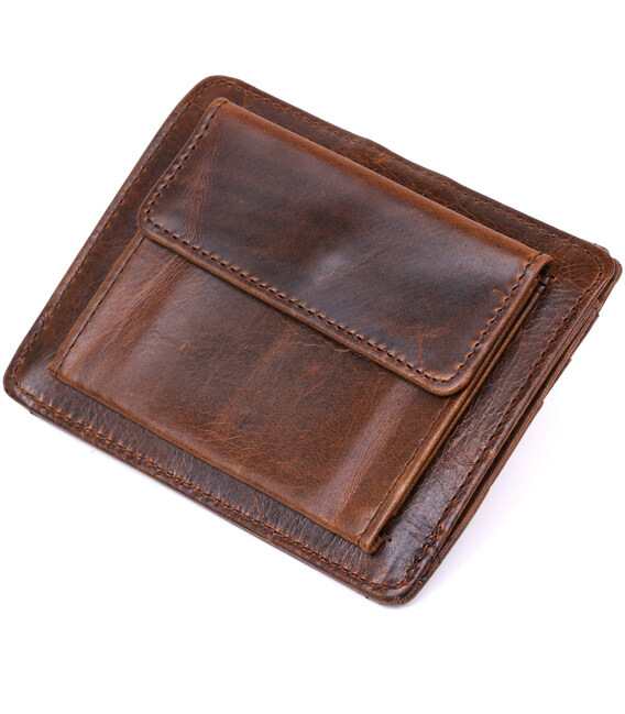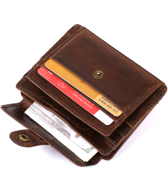 Оригінальний чоловічий гаманець невеликого розміру із вінтажної висококласної шкіри підвищеної міцності. Має відділення для купюр, слоти для кредитних карток, прозору кишеньку та невелику монетницю на кнопці. Такий гаманець займає мало місця, при цьому все необхідне завжди буде при Вас. Колір виробу - коричневий, що виглядає дуже красиво.