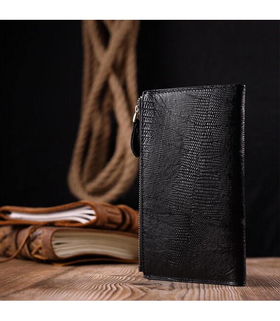 Місткий гаманець з натуральної шкіри з тисненням під рептилію. Складається аксесуар навпіл, закривається на кнопку. Якісна фурнітура доповнює та прикрашає виріб. Такий гаманець з натуральної шкіри - це ідеальний варіант на кожен день для тих, хто цінує якість, зручність та комфорт, а також чудово доповнюватиме Ваш повсякденний образ. Запакований аксесуар у фірмову коробку та пакет бренду. Вироби з натуральної шкіри завжди будуть чудовим подарунком для близької людини.